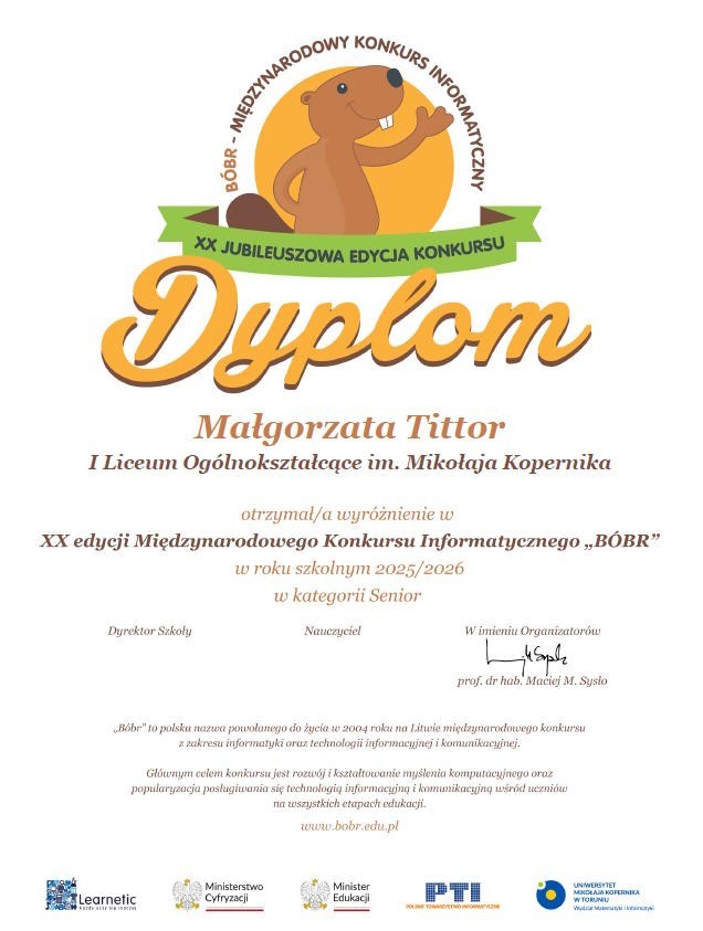 uzyskała wyróżnienie w XX edycji polskiej Międzynarodowego Konkursu Informatycznego "Bóbr"